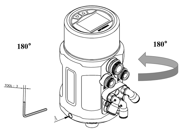 将定位器与阀门连接之后,定位器可与阀门之间做角度调整。若需要调整定位器操作界面角度,松开A处的内六角紧定螺钉后,顺时针或逆时针180°范围内调整到需要的角度,再拧紧紧定螺钉。